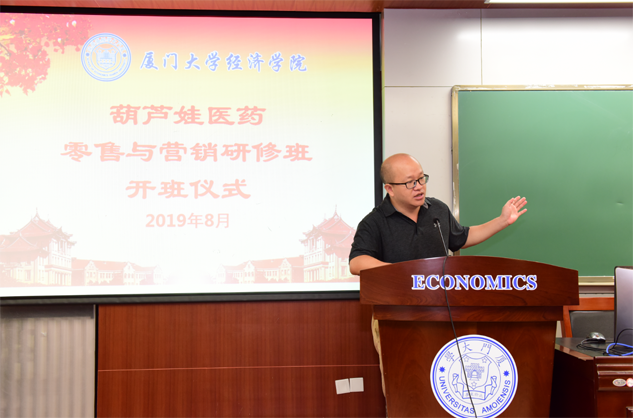在开班仪式上,廖景峰主任首先代表厦门大学经济学院热烈欢迎BG大游医药零售与营销研修班的学员到厦大学习,并就厦门大学及经济学院的相关情况进行了介绍。他说,BG大游学员走进厦大就是厦大的校友,希望未来的日子能够关心、支持母校的发展,多提宝贵意见,同时他也祝大家在厦大学习期间学有所成、学有所获。